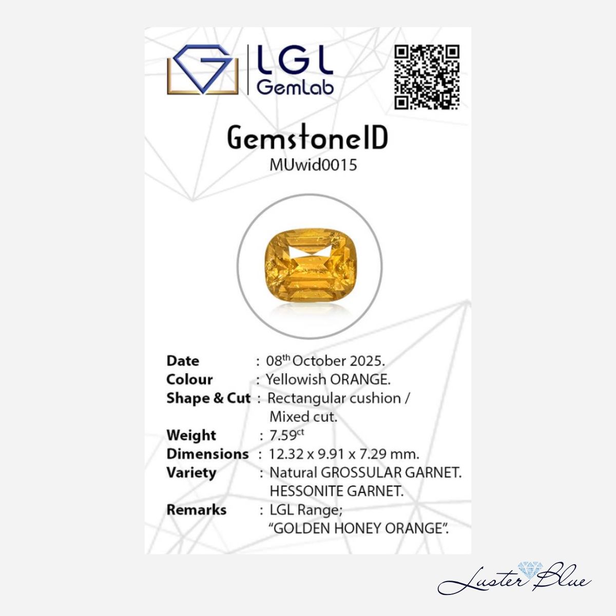 A striking 7.59ct Natural Hessonite Garnet displaying a rich golden honey–orange colour with lively brilliance and excellent visual depth. Expertly cut in a rectangular cushion mixed cut, this gemstone offers strong light performance and a refined, symmetrical appearance. Classified within the LGL colour range as “Golden Honey Orange,” this hessonite showcases the warm, fiery character that makes fine-quality grossular garnets highly desirable.